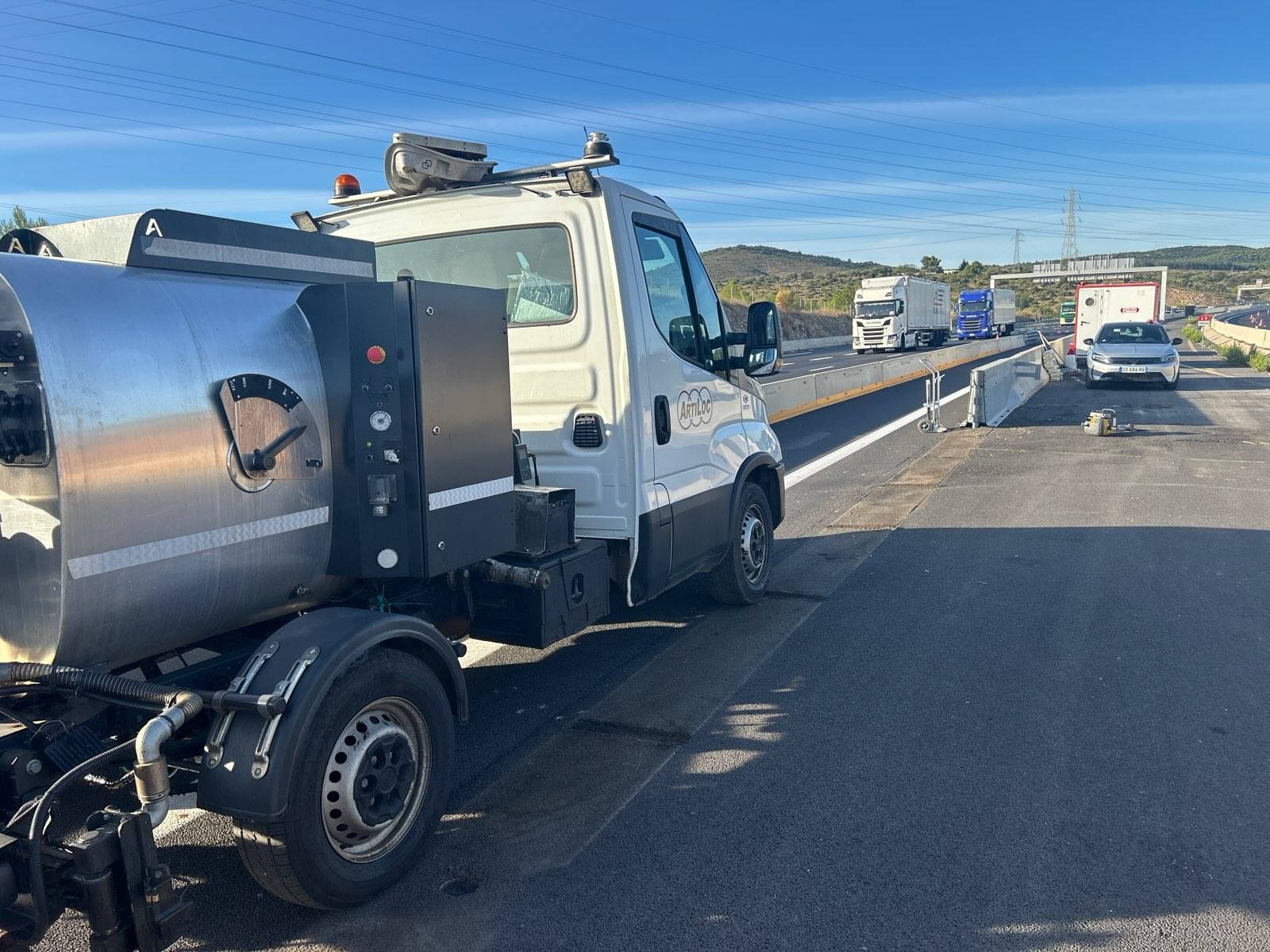 Ces répandeuses sont également équipées d'une lance avec un tuyau d'environ 12 mètres, permettant une application manuelle lorsque la chaussée est trop étroite et que le camion ne peut pas passer.
