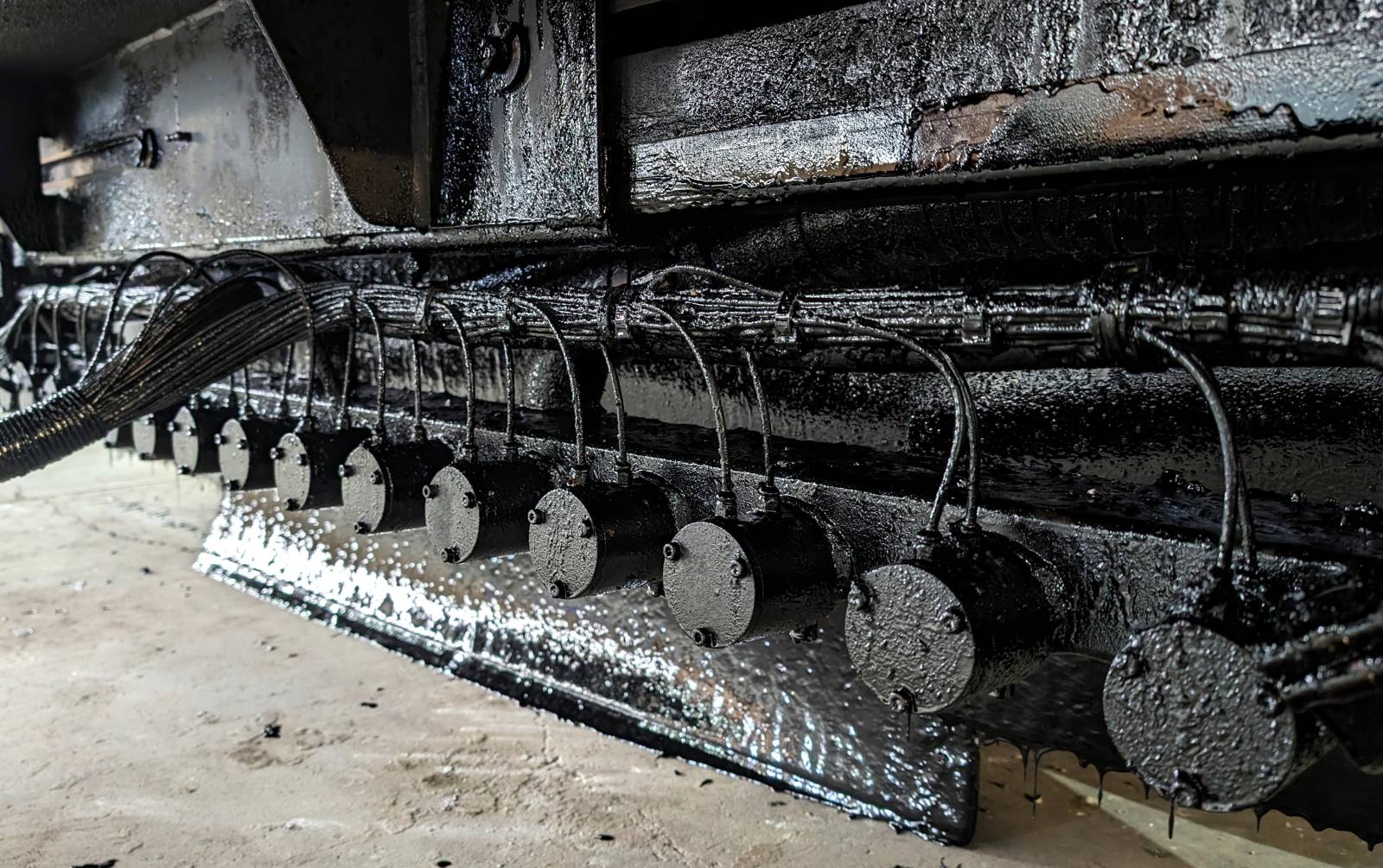 Chauffée dans une cuve pour atteindre la température optimale d’application, cette émulsion est pulvérisée sous pression sur la chaussée par une rampe munie de jets.